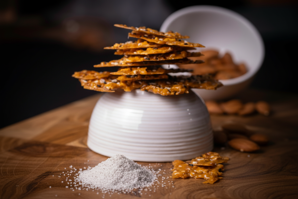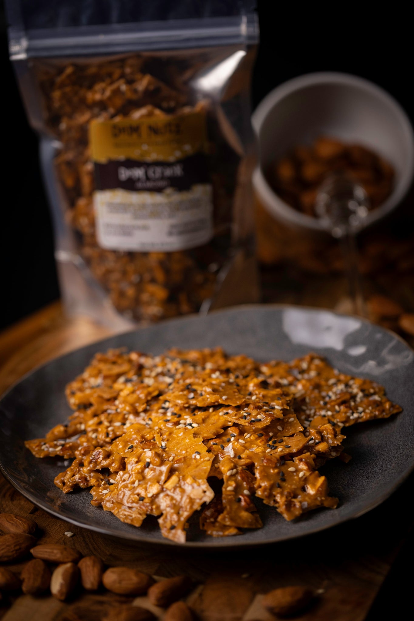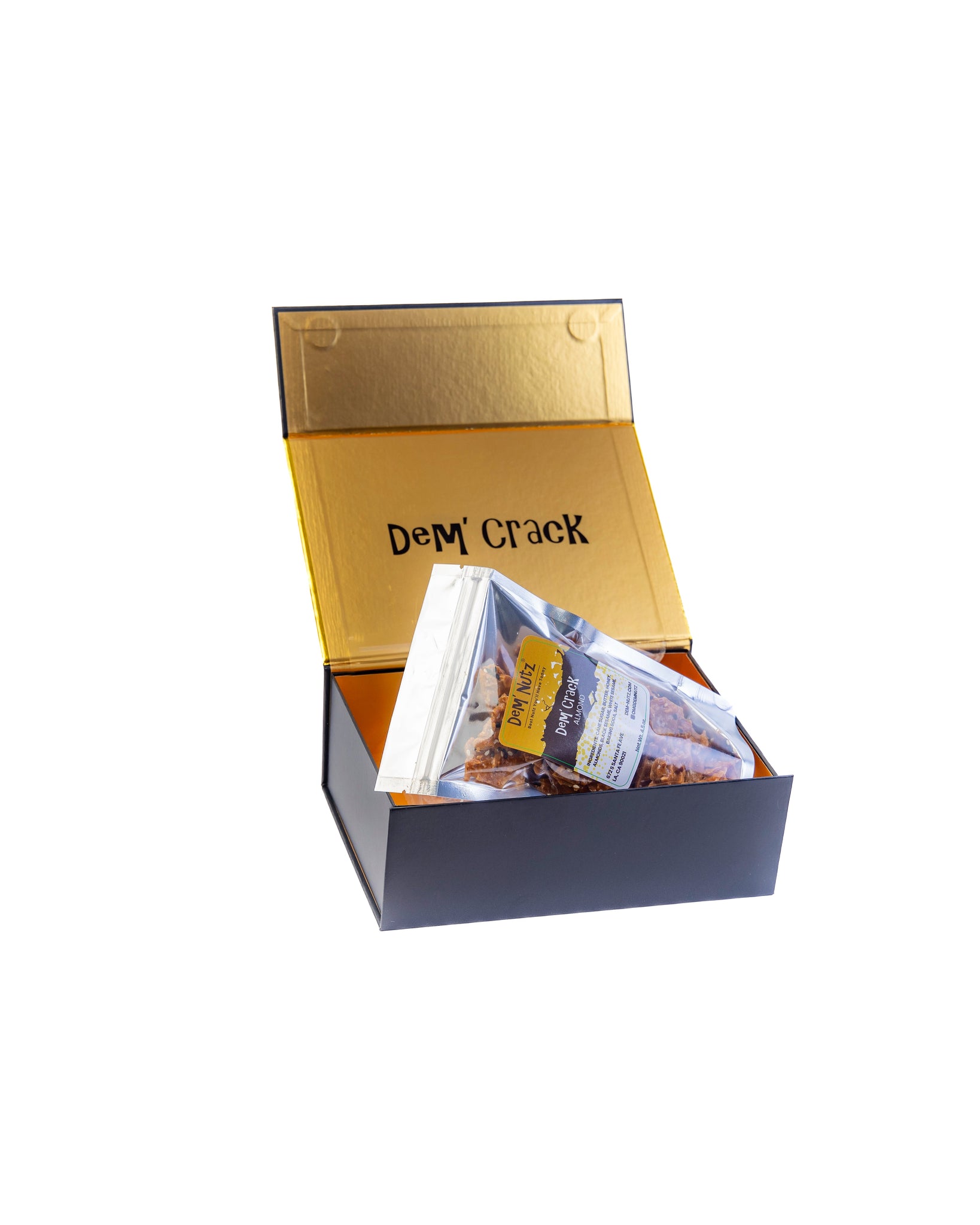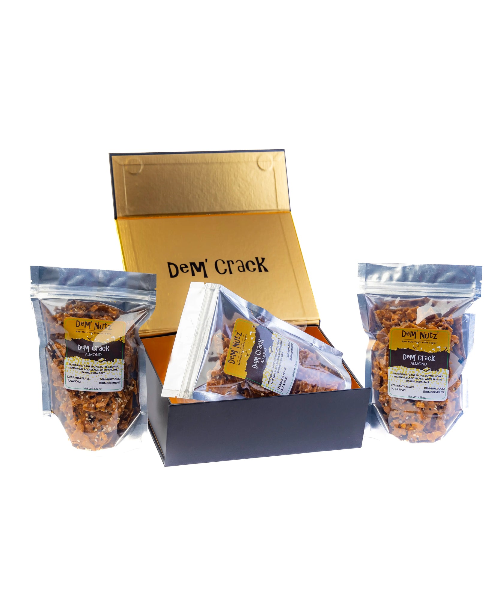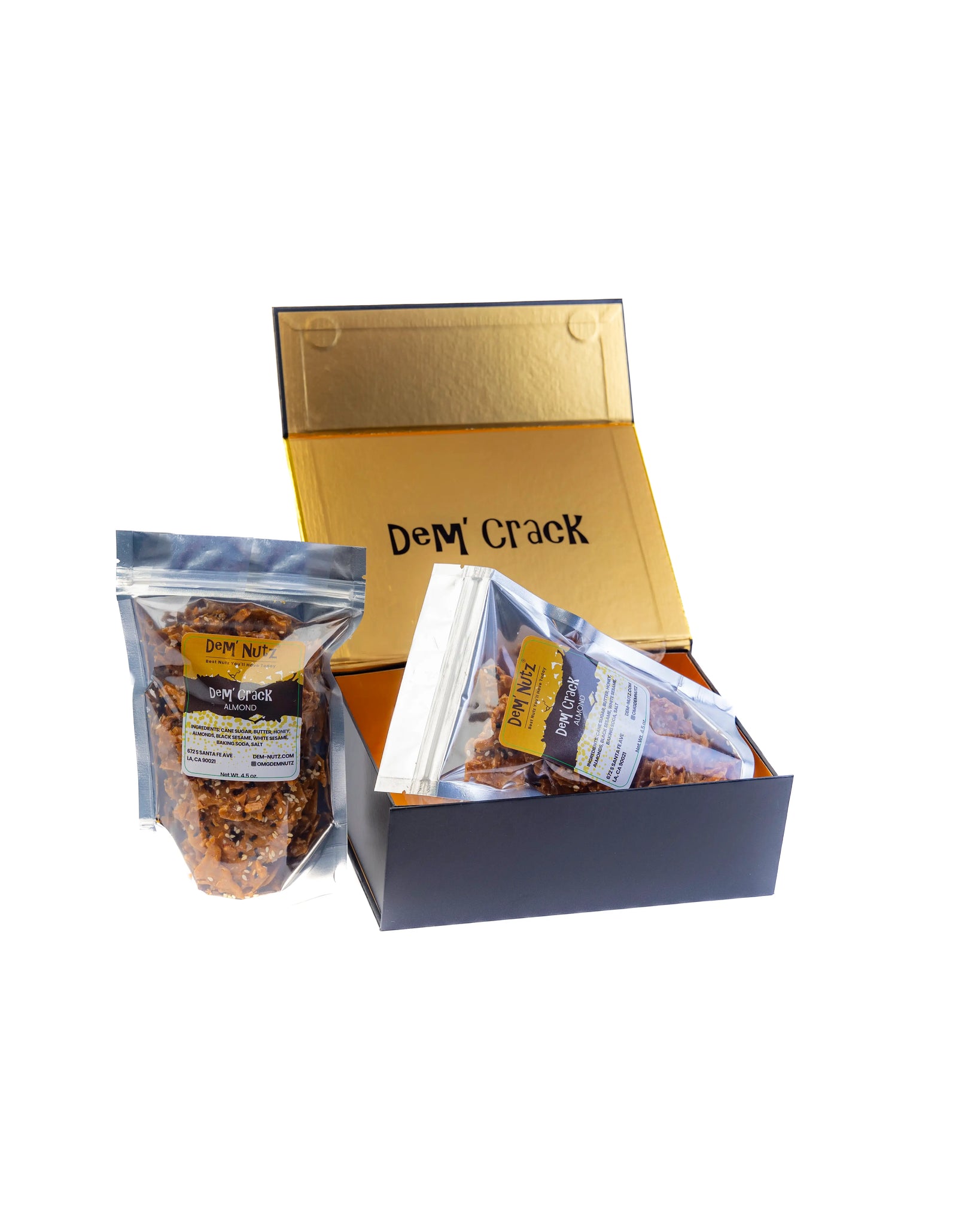 Dem' Crack, The addiction is real! Original Almond Crack is bursting with flavor. Made with natural ingredients, it’s gluten-free and corn syrup-free. This brittle is thin, crispy, and won’t stick to your teeth. A perfect balance of sweetness and savory sea salt enhances every bite, while black and white sesame seeds add a nutty twist. From the first bite, you’ll be hooked! Packaged in a stunning gift box with self-closing magnets, it’s perfect for treating yourself or giving as a gift.